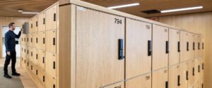 Tasakattoiset Kaso Trend -pukukaapit toimitettiin kiinteillä jalustapenkeillä varustettuna. Penkkien istuintason materiaaliksi valittiin pyökkilauta ja istuintason alle varusteltiin kenkätelineet. Lukoiksi kohde valitsi Digilock Versa -koodilukot.